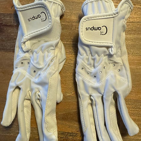 Hvide stævnehandsker, str 7. Brugt til pige 10 år.