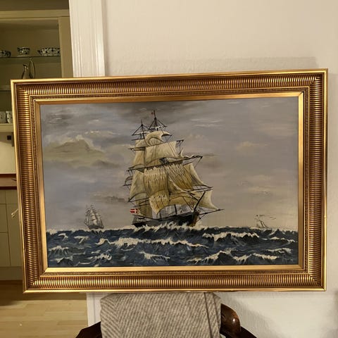 Skibe på vandet ved solnedgang, flot motiv af marinemaleren Arup Jensen. Olie på lærred, signeret Arup Jensen. I rigtig god stand med pæn ramme. Måler 65x95. Rammemål 80x110.