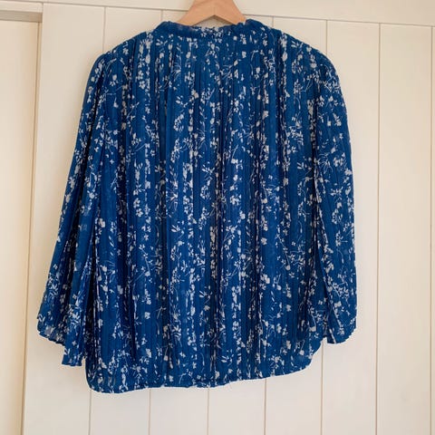 ØNSKER AT KØBE SØGER denne blå og hvide bluse fra vakker str xxl