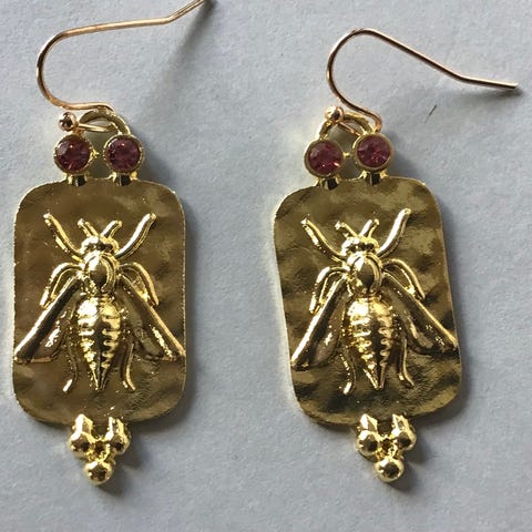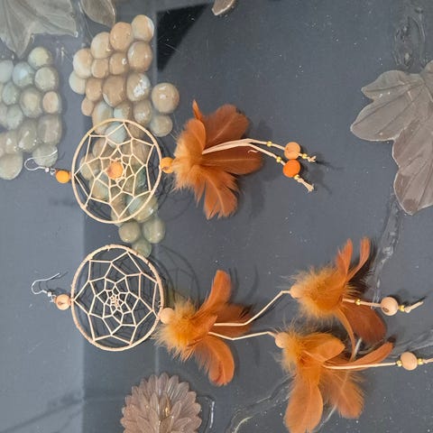 Helt nye øreringe med vedhæng, der forestiller drager, i farven antik bronze. Selve vedhænget måler 3,5 cm og består af bronzefarvet metallegering. Ørekrogene er selvfølgelig nikkelfri. Se også mine andre annoncer med øreringe.