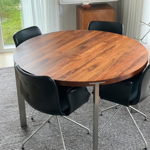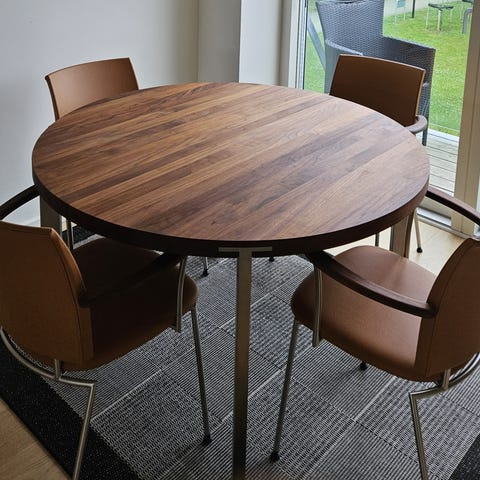 Naver spisebord Ø120. Der kan sidde 6 personer omkring det. Det har et lille hak, som man kan se på et af billederne. Der er enkelte små pletter, som ved enkel slibning kan slibers ned/væk. Hvidolieret lak følger med. Kostede ved køb 15.000, grundet hak og pletter sælges det til 7.000. Skal hentes i Odder.