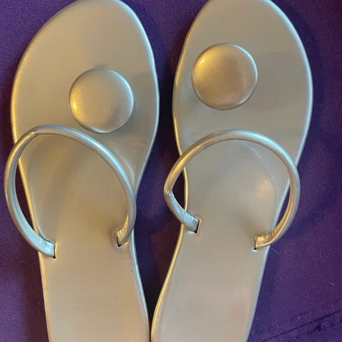 Flad, fin sandal med læderrem i guld og perler og sten. Meget komfortabel. Helt nye hæle påsat.
