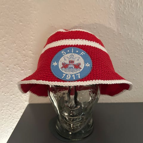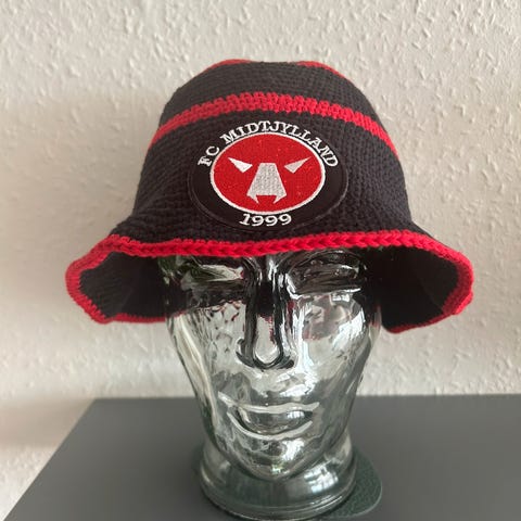 Hæklet SønderjyskE bøllehat efter egen opskrift og design. Fast pris kr. 300.
