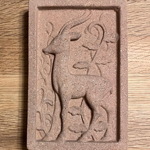 Figur i sandsten af siddende nøgen kvinde med klæde, af Just Andersen.