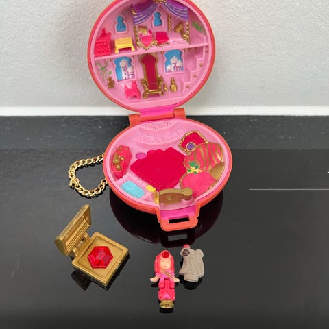 Ægte Polly Pocket fra 1992. Med fungerende lys og den oprindelige prinsessedukke og hest. Mange fine detaljer og effekter. Velholdt.