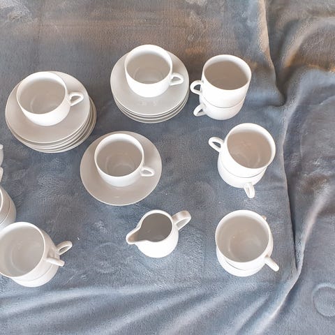Hvid Vega Kaffestel fra nu lukket kro. Sælges samlet. Alt er 100% intakt og uden skår eller revner. Der medfølger en lille kasse med hvide låg, som passer til kaffekanderne/tekanderne fra samme stel. Jeg har ingen kaffekander eller tekander.