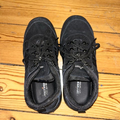 Sorte sikkerhedssko med orange detaljer. Skoene har en beskyttende klap over vristen, der lukkes med et spænde. Robust sål med godt greb.