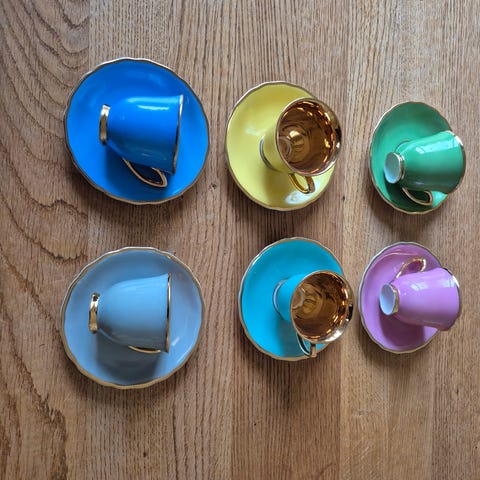 Fint sæt af tre mocca kopper med underkopper og kagetallerkner. Med guld kanter og blomstermotiv.