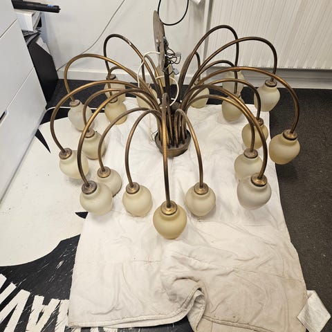 Du kan helt sikkert finde billige kroner på auktion og på dba men jeg ville aldrig hænge en sådan op da ledningerne altid er smuldet fuldstændigt op i isoleringen (stofledninger) og der er som regel også defekte fatninger.