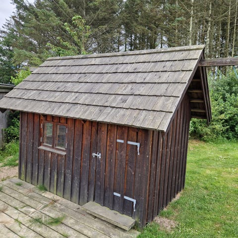 Dejligt nyt rustikt legehus til brug hele året i trykimprægneret træ - huset har plexiglasvinduer med skodder, todelt stalddør med vindue, vandtæt undertag, skorsten, en stige og selvfølgelig et fuglehus,