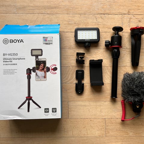 Det perfekte start kit til alle nye video skabere. Kun ved hjælp af din telefon kan du transformere dit værelse om til et videostudie. Stativet kan holde din telefon og bliver suppleret af en lys ring der er med til at give det professionelle touch. Sættet har også en mikrofon som kan forbindes til alle smartphones og skaber en flot lyd.