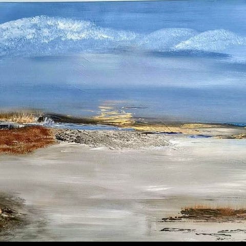Akryl på lærred 20x20cm, med malede kanter, fra august 2025, "himmel og hav" - inspiration fra Sjællands Oddes sten strande. Original maleri af Louise Boye Manhart.