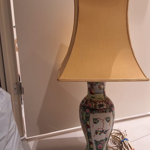 Flot kinesisk bordlampe med naturmotiv i porcelæn med messing med fin skærm med et diskret mønster.