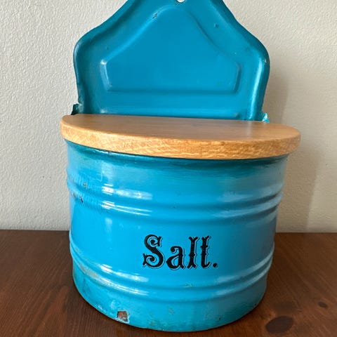 Saltkar af emaljeret jern med træ låg. I fin stand. H. 24. B. 15. D. 11 cm.