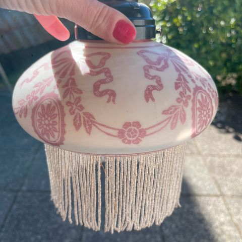 Smuk lampeskærm. Pletter ikke forsøgt fjernet. Købt som på billedet, så det er ikke mig der har syet stoffet fast på stativet. Meget smuk og speciel. Kan vist både bruges som loftslampe og standerlampeskærm.