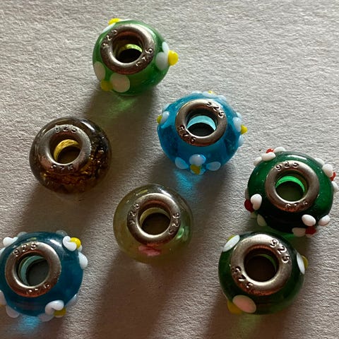 Smukke Pandora charms i Muranoglas og sterlingsølv. 75 kr pr stk eller 250 for alle fire charms samlet.