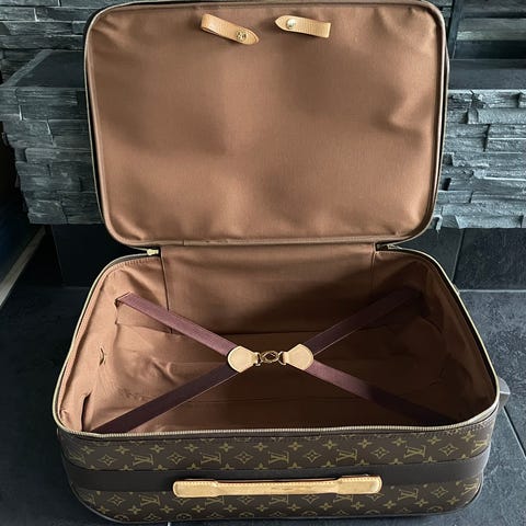 Louis Vuitton Eole 60 Monogram ( M23202) trolley med 2 hjul ( kuffert). Str. 60x33 cm. Den er brugt og har nogle brugspor ( ses på billeder). Jeg tror, at jeg også har Duts bag. Den kan sendes mod betaling. Dem købte vi i 2009 og prisen som ny var 9850 kr. Jeg har kvittering, og så kan jeg sende en kopi, men jeg beholder den original fordi jeg har flere ting i den. Jeg betaler normal fragt , hvis den skal sendes,