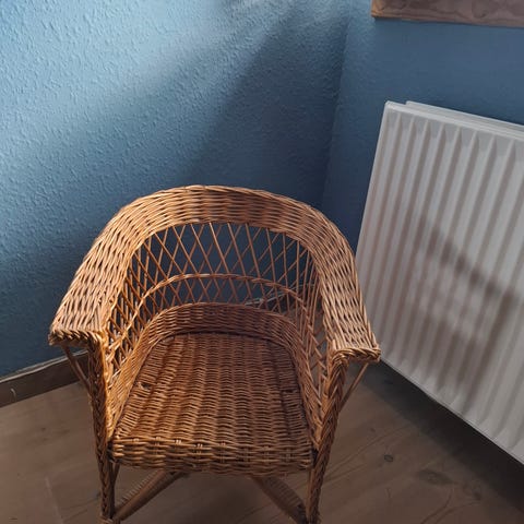 En super sød vintage kurvestol/loungestol inklusiv betræk til børn. Stolen er i overordnet rigtig god stan, men fremstår med almindelige brugsspor. Som ses på billedet er der lidt snor viklet rundt om det forreste ben. Det kunne sikkert gøres mere usynligt, med lidt lim eller andet. Betrækket er i god stand og meget tidstypisk fra 60’erne eller 70’erne. Jeg har aldrig set en lignende stol. Sendes ikke