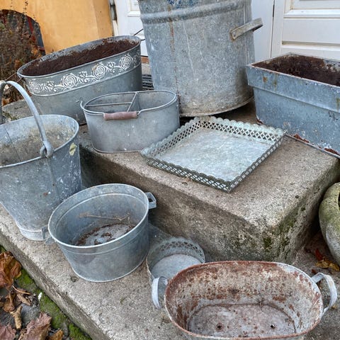 Andet, Zink, Ældre zink fodertrug med aldersrelaterede spor (patina), 8 stk. til salg, har gennemgående hul til jord, huller til ophæng og huller i bunden til dræn.