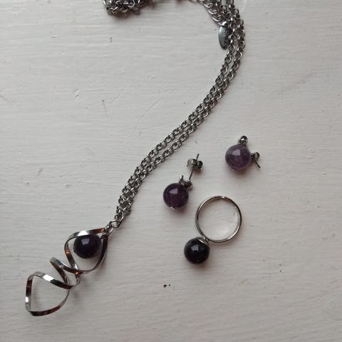 Andet smykke, LBVYR, Halskæde med perler og glimmerkugle og ring med 12 lilla sten - ca 1,7 cm i dia.