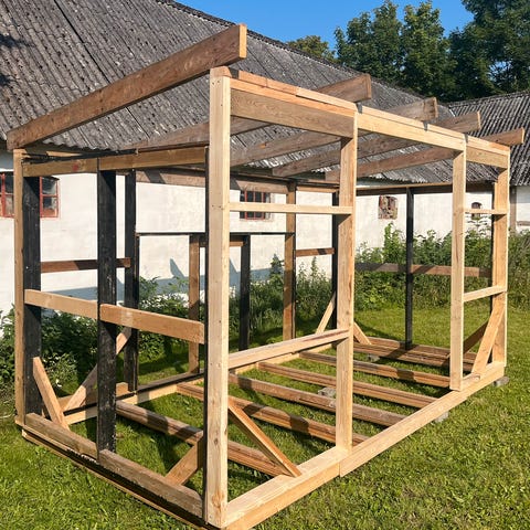 Tømmer konstruktion, 40 m2 havehus konstruktion (35+ 5 m2). Restsalg skelet rammer, gulvbjælker og spær. Delvis af genbrugstræ,