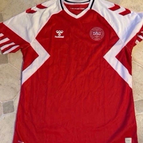 Rød Danmarkstrøje med hvid tekst.. Lækker lettørrende stof og stort set ikke brugt, derfor som ny. Størrelse L. Mrk. Puma. God til sport eller fritid.