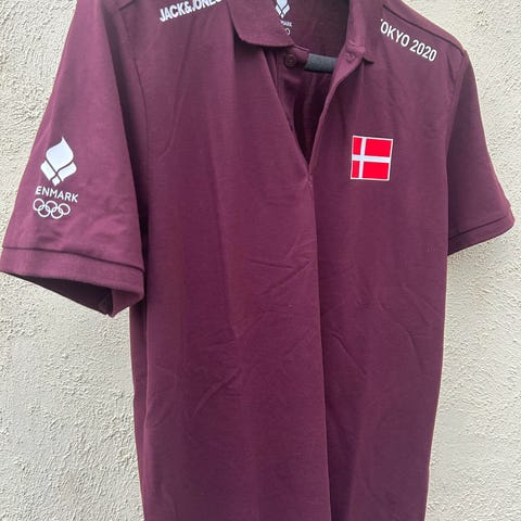 Rød Danmarkstrøje med hvid tekst. Bomuld og dejlig blød. Stort set ikke brugt, derfor som ny. Størrelse L. Mrk. ID Identity. T.Time.