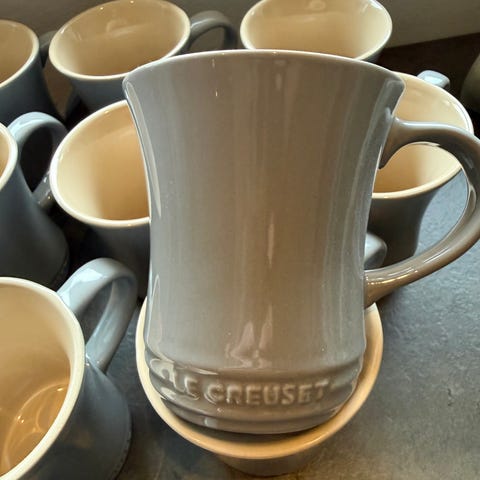 6 stk. grå krus, som ligner Le Cruset.