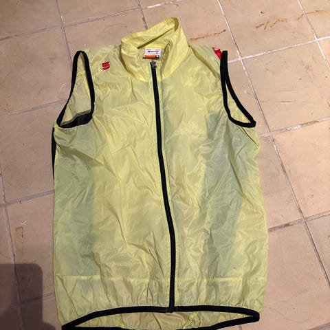 Vest i røde og hvide Danmarksfarver. Lækker lettørrende stof og stort set ikke brugt, derfor som ny. Størrelse M. Gennemgående lynlås. Mrk. Parentini.