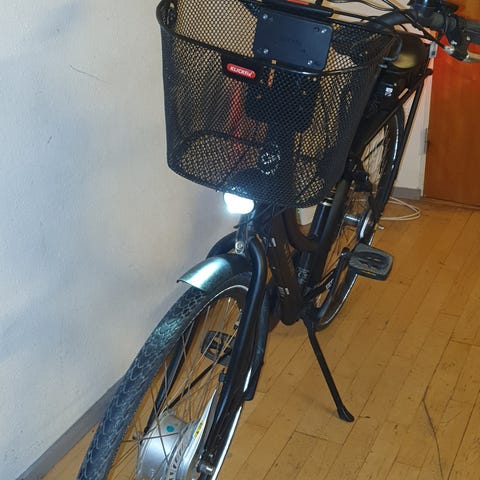 Cyklen sælges inkl. batteri, lås og kurv, klar til brug.