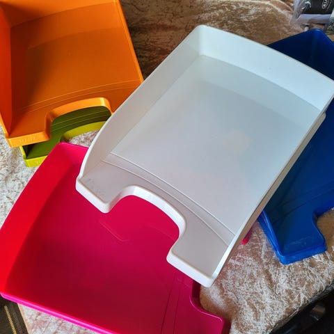 Brevbakker i stativ med plads til 3 brevbakker i hver. Har ekstra. De fleste er fine. Få af dem er knækket lidt, men de følger med i prisen.