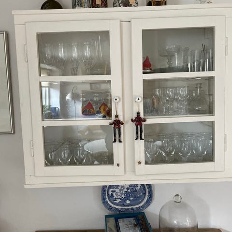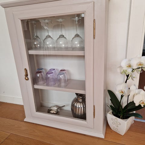 Væghængt vitrineskab med 3 hylder og 2 skuffer.