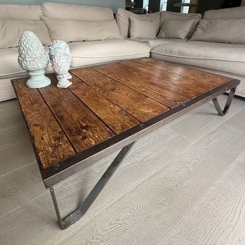Sælger skønt unikt vintage sofabord købt på loppemarked i Amsterdam (450€) – råt og karakterfuldt møbel, som kombinerer industrielt design med varme materialer.