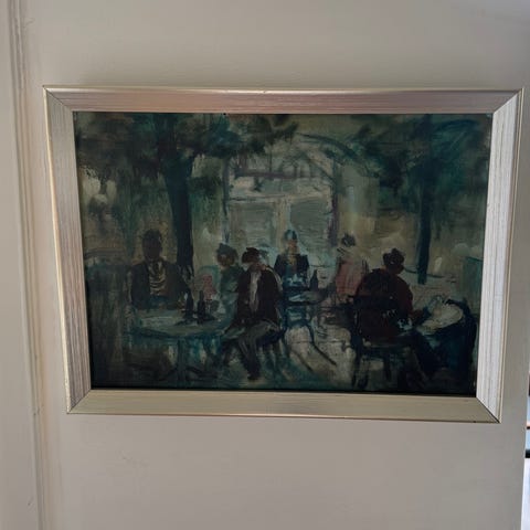 Poul Kastrup maleri, olie på lærred, indrammet. Kunstværket viser en gruppe mennesker i en interiørscene. Farverne er levende og penselstrøgene udtryksfulde. Maleriet er signeret af kunstneren og leveres med en dekorativ ramme, der fremhæver værkets detaljer. Ideelt til kunstsamlere eller som en unik dekoration i hjemmet.