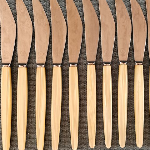 Bordknive fra Dansk Knivfabrik Denmark. Lundtofte Stainless. Knivene er fremstillet af rustfrit stål med elfenbensfarvede skafter med et klassisk udseende. I alt 9 stk. Samlet pris 125 kr.