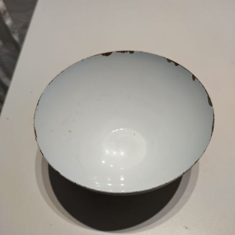 15 cm. i diameter. Blank yderside. Pæn stand. Der er en lille fejl i emaljen og mindre spor efter brug.