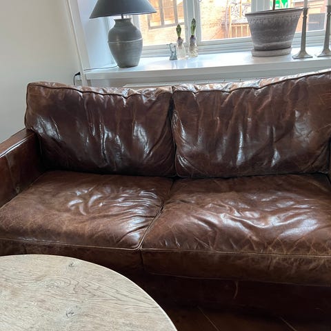 2 stk læder sofa. Er i god kvalitet, ingen huller i læderet. Dansk designet, mærke er faldet af med tiden, så designer står som ukendt. Pude indhold er fra NF møbelpude.