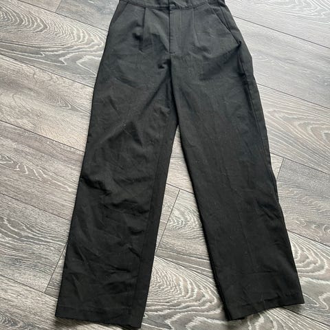 Bløde ig komfortable bukser. Koksgrå bund med tern i smalle, lysegrå striber. To skrålommer fortil og to lommer bagpå samt navnet over den ene baglomme. Lukkes med lynlås og knap. Stropper til bælte.