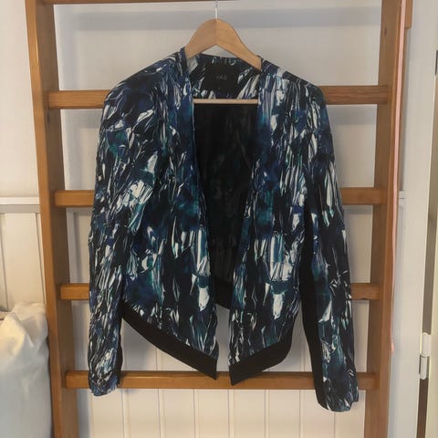 Y.A.S jakke i blå changerende farve til kvinder i størrelse L. Jakken er fremstillet af 95% polyester og 5% elastan, med foring af 100% polyester. Den har en klassisk design med to lommer foran og en knaplukning. Velegnet til både hverdag og formelle anledninger. Brystmålet er cirka 106. Bemærk blusen medfølge ikke.