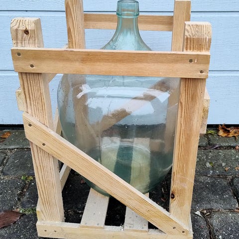 Sælger denne flotte og rummelige vin glasbeholder (også kaldet en damejeanne), som står solidt i en beskyttende plastkurv med håndtag. Den er ideel til hjemmebrygning af vin, cider eller øl – men kan også bruges dekorativt fx med lyskæder, tørrede grene eller som en rustik vase.