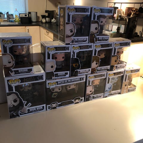 Fire forskellige figurer fra game of thrones fra fire forskellige serier har opgivet og samle alle og derfor bliver de solgt billigt langt under hvad de står til i den officielle app. De har aldrig været ude af kassen men to af kasserne har desværre mærker efter prisklistermærket . Funko Pop