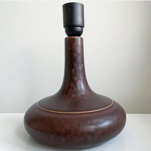 Skandinavisk modernisme. Rustik og smuk dansk håndlavet bordlampe i stentøj fra midten af århundredet. Fremstillet af Desiree Stentøj (Désirée Ceramics) i Danmark. 1960'erne. Lampens krop viser en enkel linjeføring, og glasuren går fra mørk brun oxblood-lignende glasur, der falmer, til dyb sort. Glasuren har en let craquelé-effekt som er helt normalt for dette stentøj.