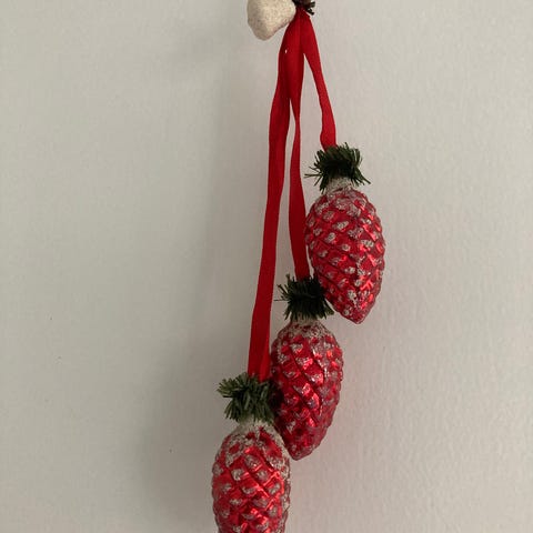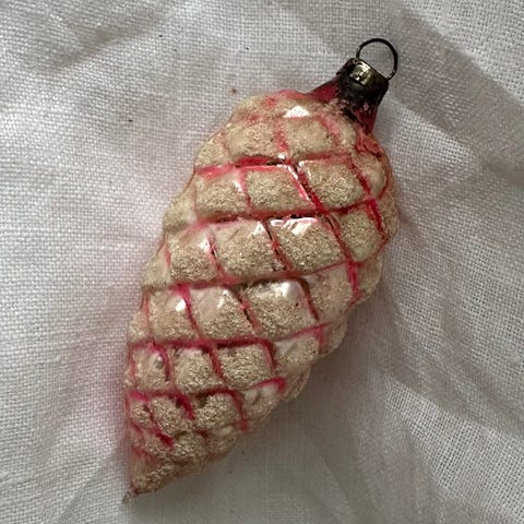 Gammelt foliepynt fra 50'erne. Med grankogler i glas. 3 grankogler på hver foliegren.