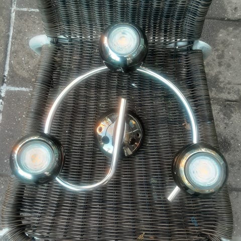 Fin og enkel loftbelysning perfekt til gang eller andet, de 3 lyskilder kan drejes, så de kan vendes i foskellige retninger. Længde 57,5 cm, brede 5 cm og højde 16 cm. Ser næsten ny ud.