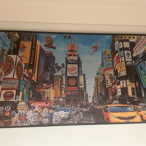 Maleri af upcoming kunstneren Stripes. Det er en spændende historie med tegneserie karakterer og der dannes en rød tråd i hele værket. Listepris 15.000kr. Pris 4400kr. Afhentes i Hellerup.