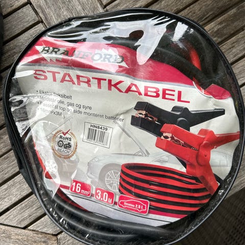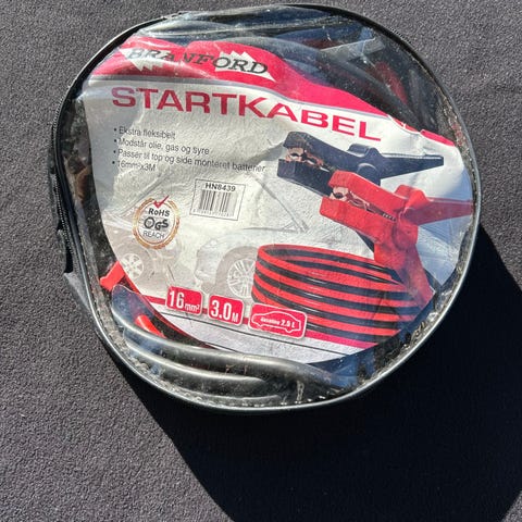 Et sæt gode kraftige startkabler med 2 meter ledninger i pose. Kun brugt 1 gang. Vejer 1,3 kg Nypris 250 kr. Sælges til fast pris + evt. Dao fragt.