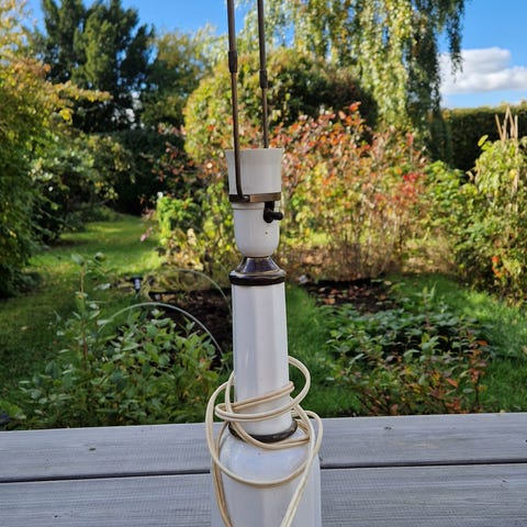 Heiberg bordlampe ca. 1930. Hvid porcelæn og messing. Fin stand. Højde til fatning 37 cm, til toppen af skærmen 49 cm