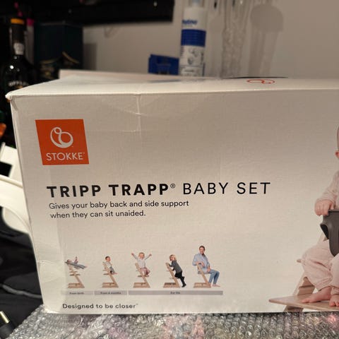 Stokke Tripp Trapp Newborn Sæt i gul. Dette sæt er designet til nyfødte og kan fastgøres på Stokke Tripp Trapp stolen. Det inkluderer en sikkerhedssele og en blød, gul polstret betræk med mønster. Fremstillet i Holland, dette sæt tilbyder komfort og sikkerhed for din baby.