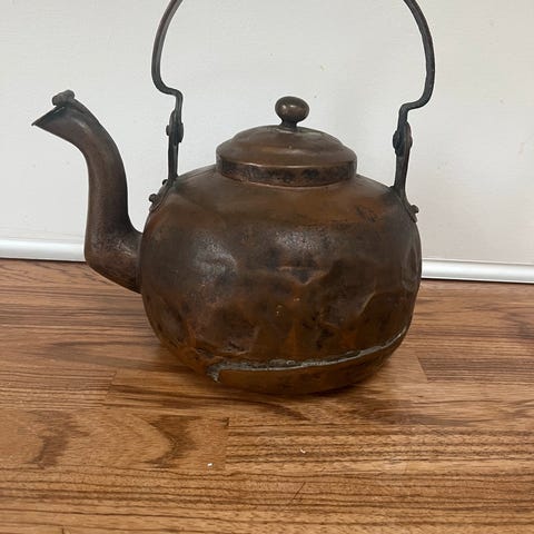 antik kobberkande, messinghank, vintage kande, rustik vase, patina, kobber dekoration, fransk landstil, shabby chic, dekorativ kande, loppefund, kobberkrukke, landlig indretning, bondehusstil, gammel kande