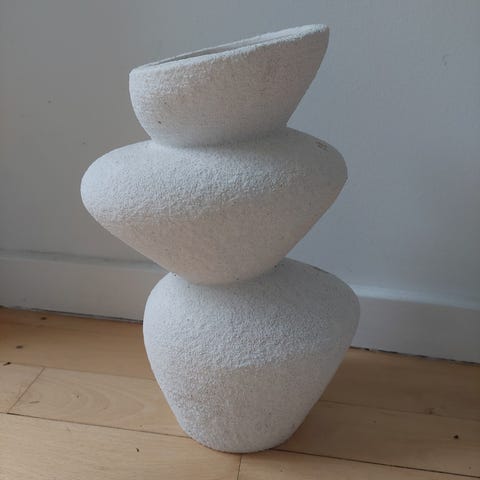 Smuk og moderne vase i mat, hvidt stentøj med bølgende former og asymmetrisk åbning. Vasen måler ca. 30 cm i højden og er perfekt som centerpiece på spisebordet, i vindueskarmen eller til et par tørrede grene. Den minimalistiske og skulpturelle stil passer godt ind i både moderne, nordiske og naturlige hjem.